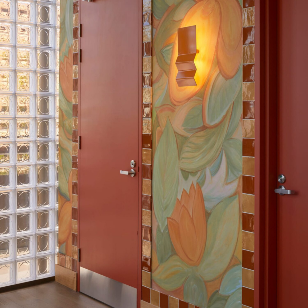 Os artistas cênicos Mel Young, Mary MacDougall e Hugh Anderson, desenhados a partir do teatro e do cinema, contribuíram com superfícies pintadas à mão que incorporam a história diretamente nas paredes, um modo de colaboração que o estúdio manteve em projetos anteriores.