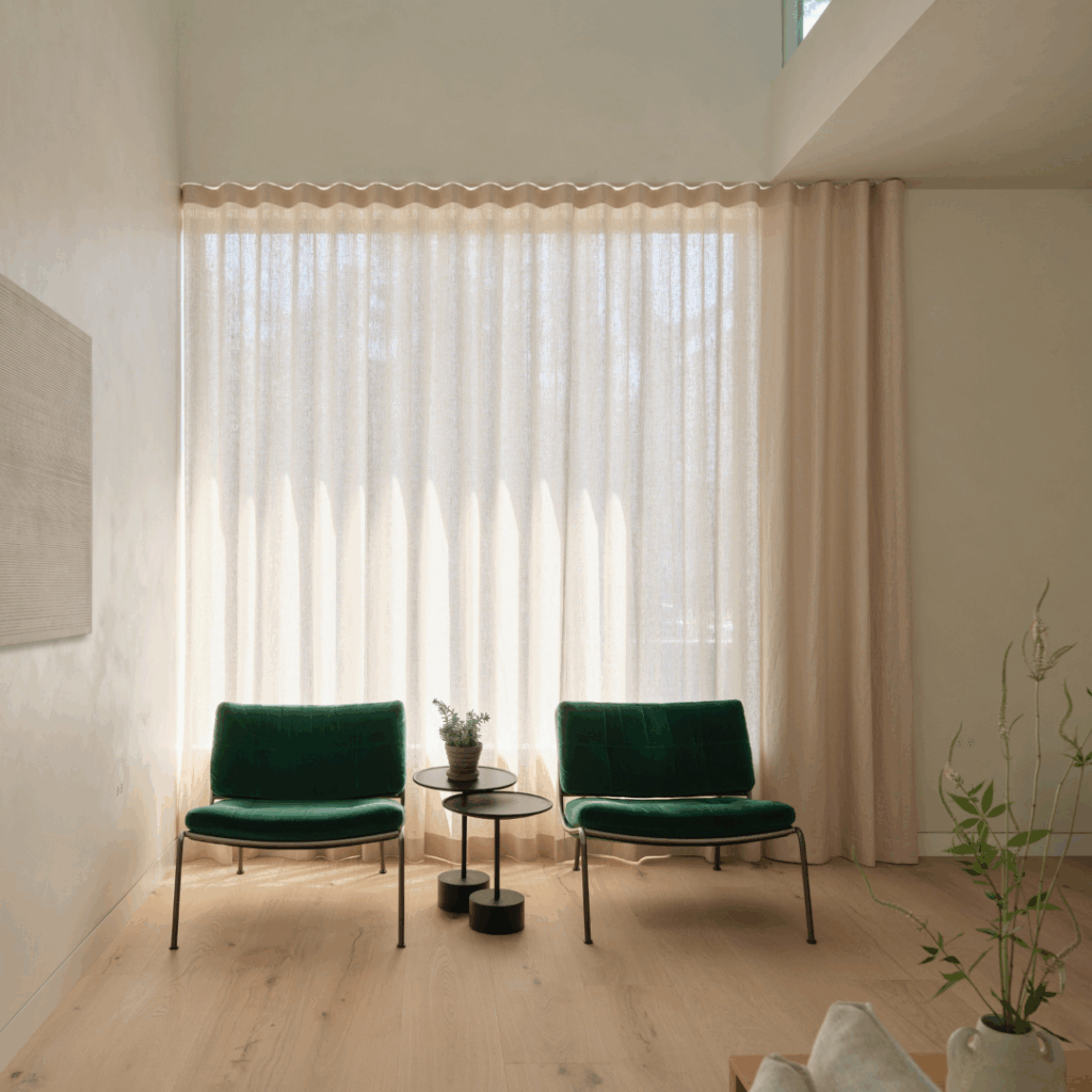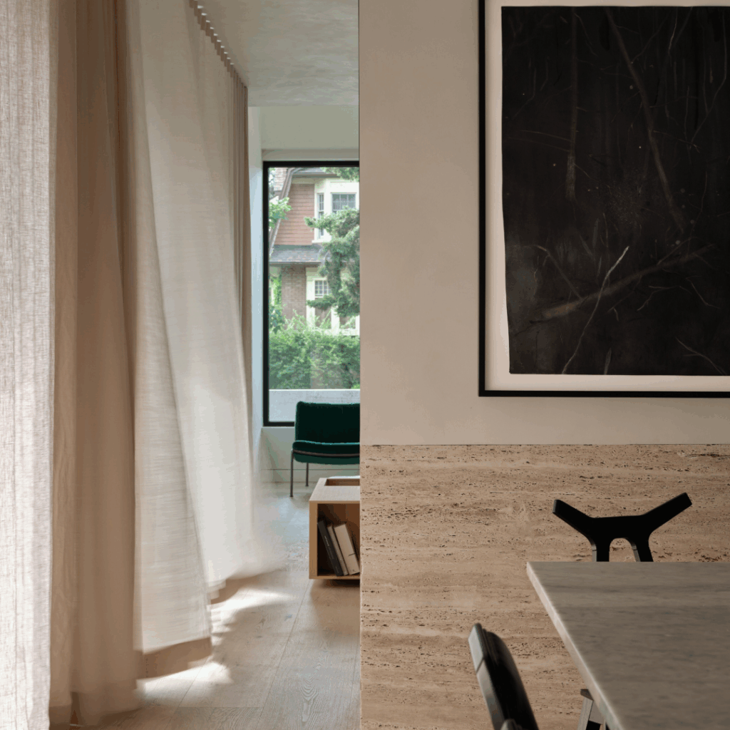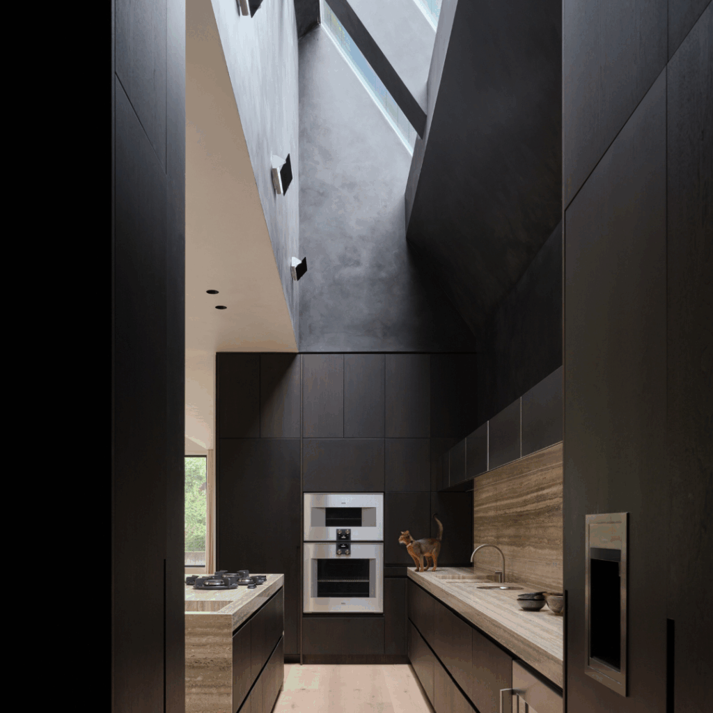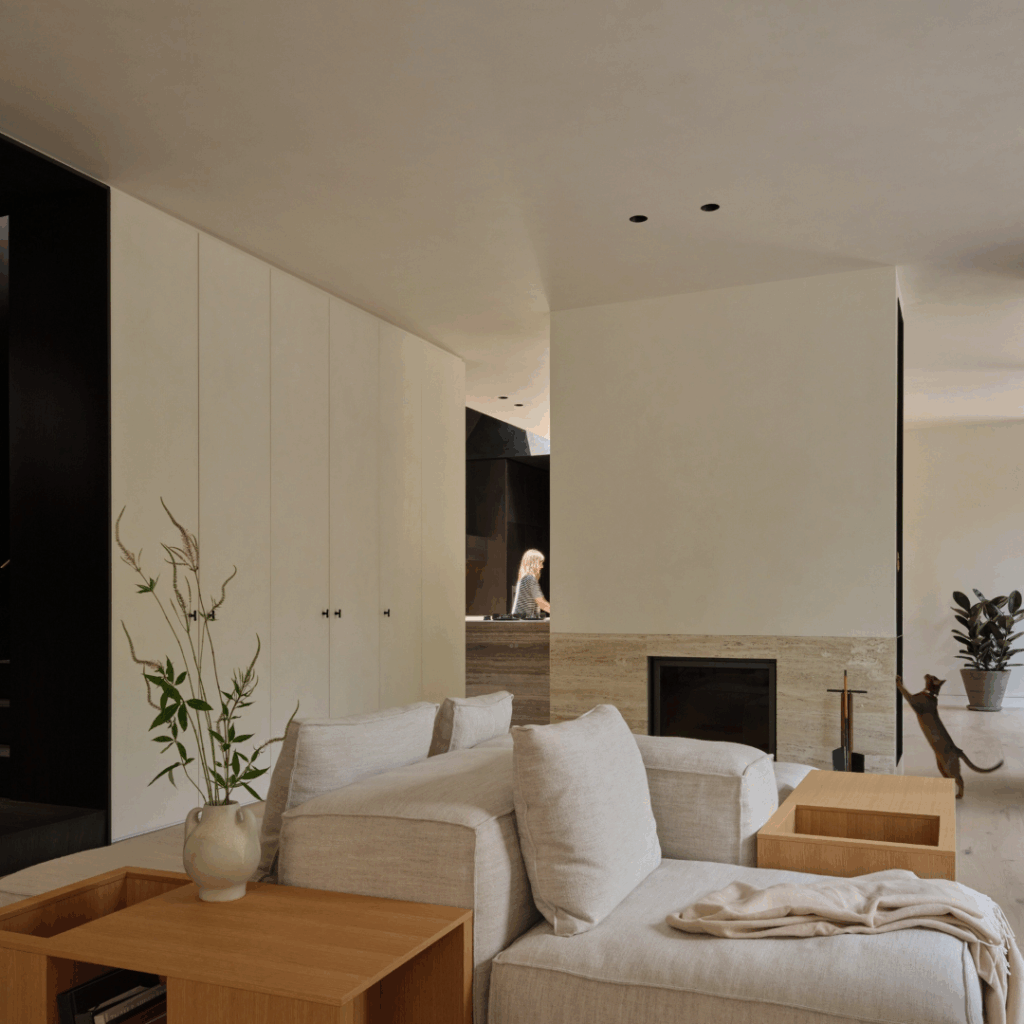 A paleta contida consiste em nogueira serrada lisa manchada de escuro, travertino pesado não preenchido, concreto e paredes de cal texturizada escura que se justapõem fortemente contra a altura dupla, paredes de lavagem de cal macia cheias de luz, pisos de carvalho branco com nós de tábuas largas e cortinas e tecidos de linho macio.