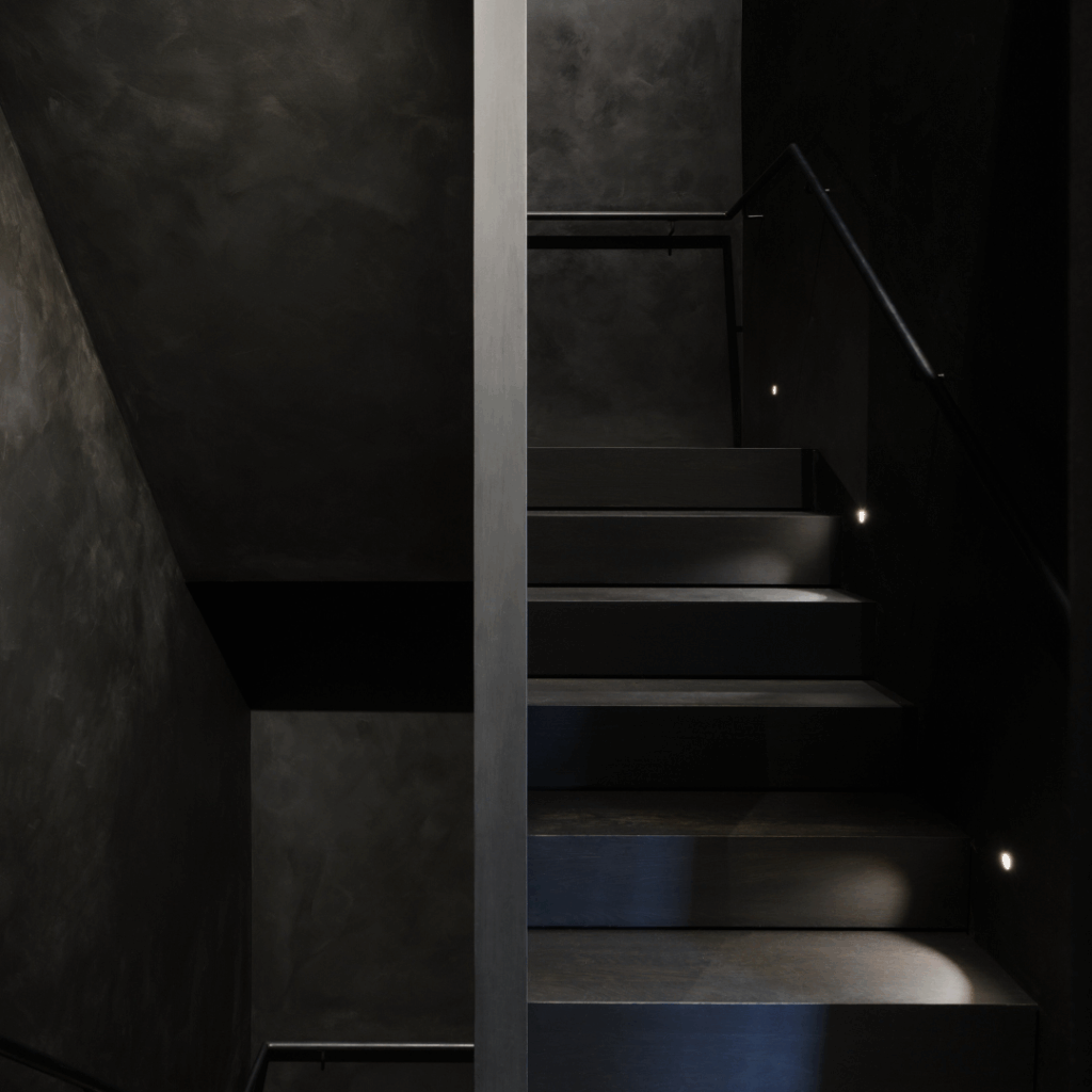 Este espaço íntimo no exterior da casa estende as condições internas escuras e comprimidas de entrada e circulação.