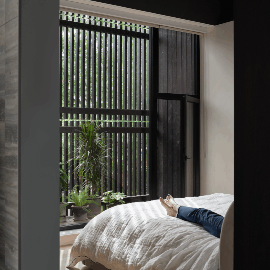 O quarto principal acima se expande para uma mansarda de telhado alto, com vista para o jardim abaixo atrás de um brise soleil de 20 pés de altura, que protege uma varanda privativa e proporciona uma sensação de pátio dentro do lote da cidade.