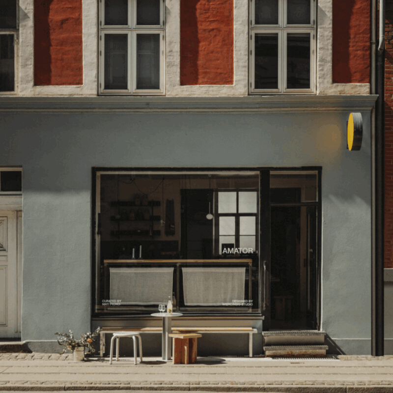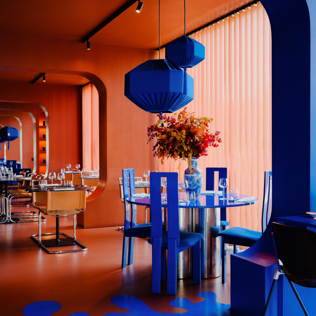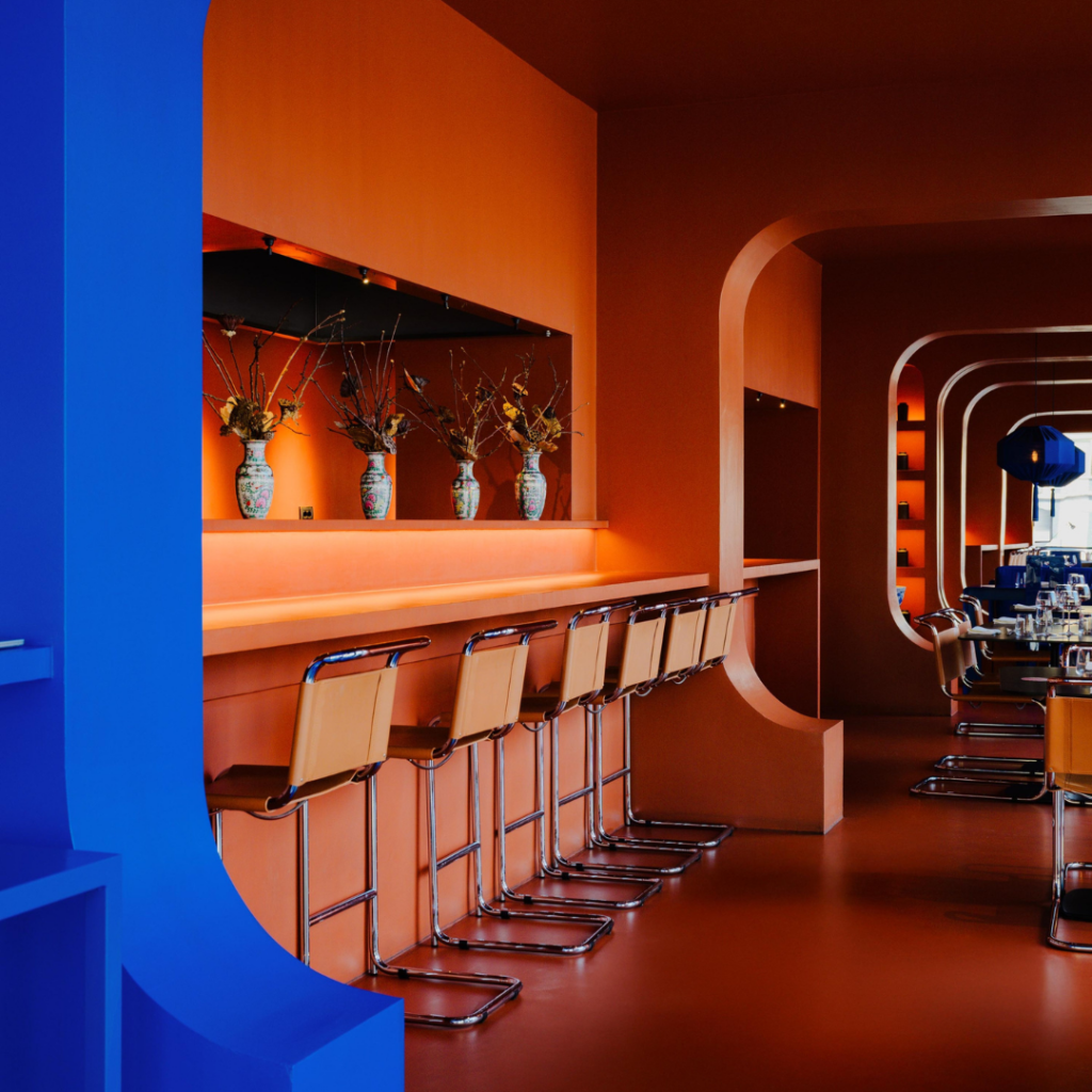 À noite, o restaurante aparece voltado para a rua como uma bolha cromática compacta, um volume quente e reconhecível que convida à descoberta.