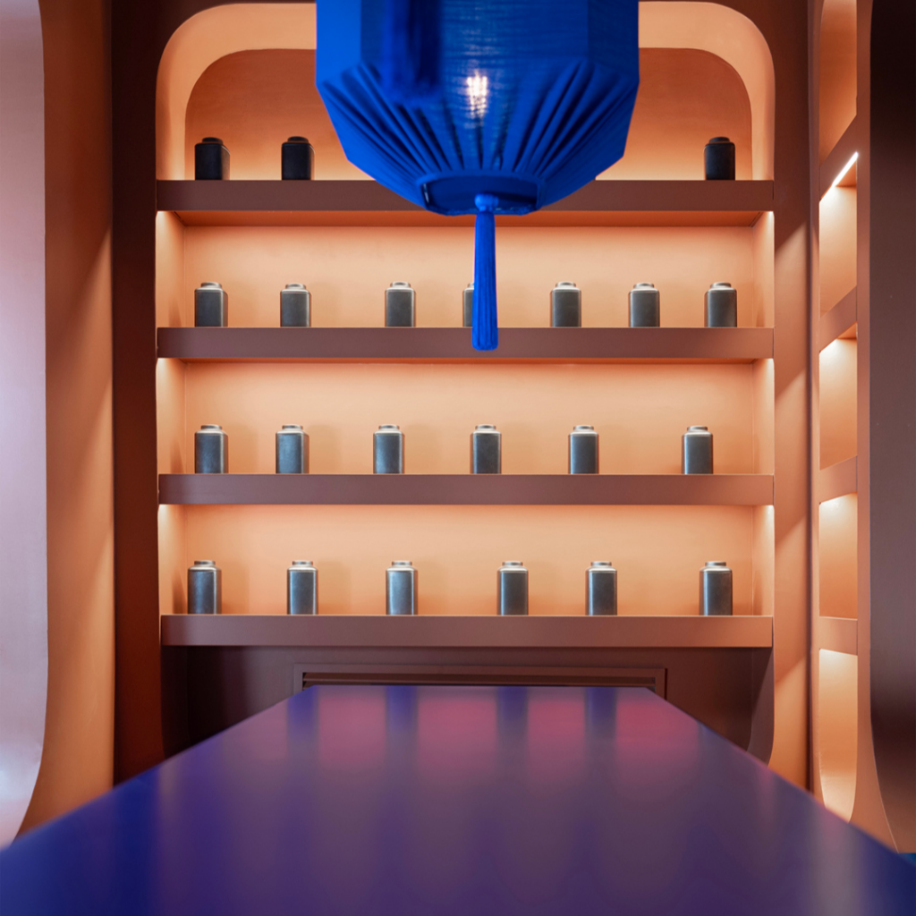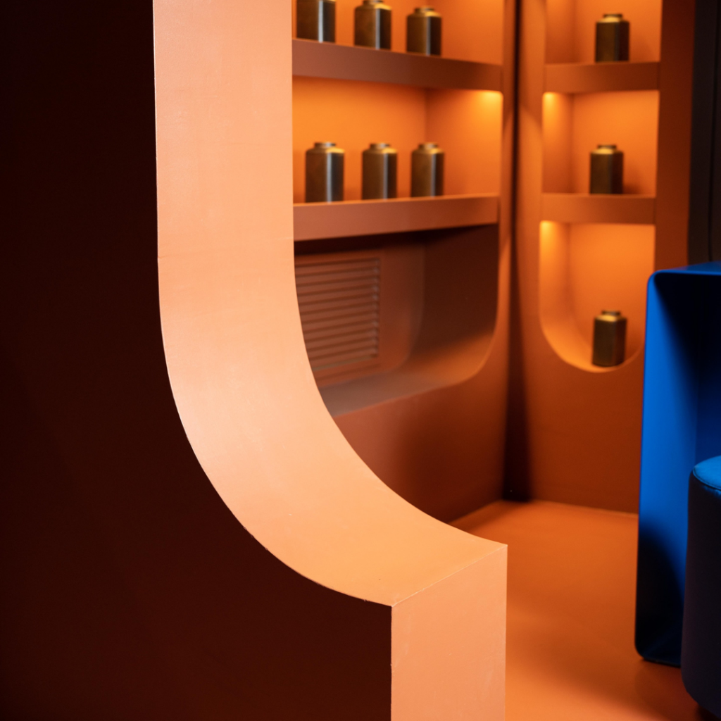 A escolha de cores é precisa: a cor do tijolo, quente e reconfortante, lembra uma dimensão terrosa e natural, uma reinterpretação elegante e contemporânea do vermelho das lacas chinesas.