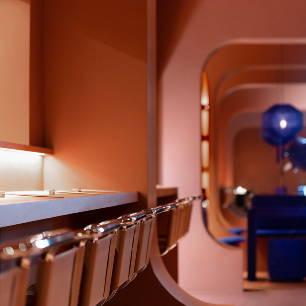 As estações com banquinhos altos o observam diretamente, remetendo à tradição da comida de rua asiática, preparada na hora e sob o olhar dos clientes.